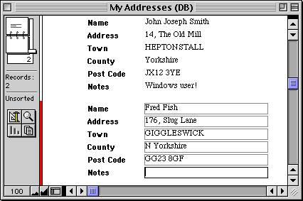 Most applications let you create layouts, giving different views of the data and sometimes including graphics. In our example, only one record is displayed, complete with the field names for the fields. Each field contains formatted text (as shown in this example), a number, or a formula. The latter invokes a calculation that makes new text or numbers, usually from the content of other fields.
