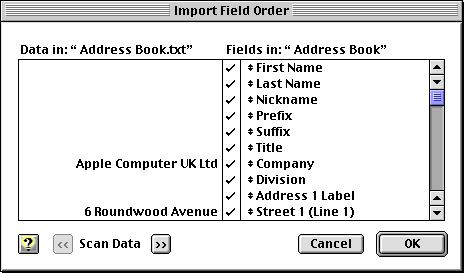 Transferring data via a tabbed text file is often very easy, although it gets harder wait an increasing number of fields. Ideally, your source application should produce a header: some applications can do this automatically, whilst in others you must create it yourself. To do this, simply make a new record with a First Name of something like AAA_First_Name, a Last Name of AAA_First_Name and a Company Name of AAA_Company_Name. Now fill in all the remaining fields, using the field name itself for each field, so that, for example Address 1 contains the text Address_1, and so on, whilst any fields that you really don’t require can be filled with an x. Finally, sort your records by your preferred name and export the information as tabbed text. Now, when you open the file in your destination application, you can see exactly which field is which.