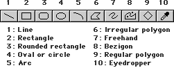 This example has tools for straight or freehand lines, square-cornered or rounded rectangles, ovals and other polygons. The bezigon tool is particularly useful, since it creates Bezier curves using four control points or handles. The fill colour and pattern for all of these tools, together with pen width, colour and pattern can also be selected. And a brush and spray can are provided for other effects.