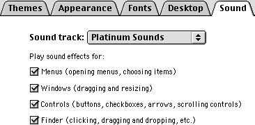 Appearance Control PanelThis control panel lets you use a particular theme for your computer desktop. It can also make your computer produce a special range of sounds, each one associated with a particular action. These sounds can be enabled by clicking on the Sound tab and choosing a particular set of sounds from the Sound track pop-up menu, as shown below:-