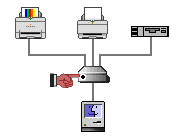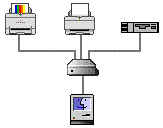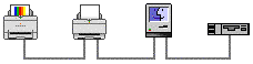 Older computers frequently incorporate an earlier generation of wired serial ports that are based on the RS-232 and RS-422 standards. Unlike USB or FireWire, these interfaces can only serve one device at a time. This means that you must use a point-to-point connection to connect every device, as in this example, where a printer is linked to a computer:-